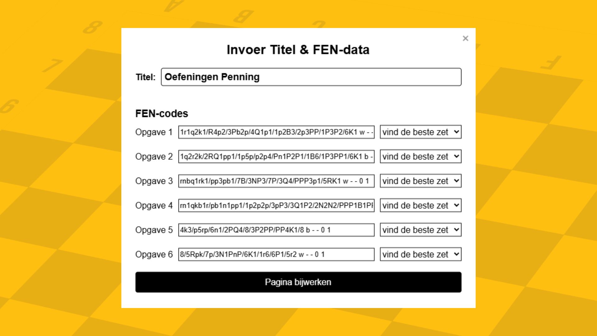 De knop "Fen-invoer" toont een venster waar 6 Fen-codes ingevoerd kunnen worden en waar een tekst bij het diagram gekozen kan worden. Tevens kan er een paginatitel worden ingegeven. Na het klikken op de knop "Pagina bijwerken" verschijnt een pagina met uw ingevoerde titel en 6 diagrammen.